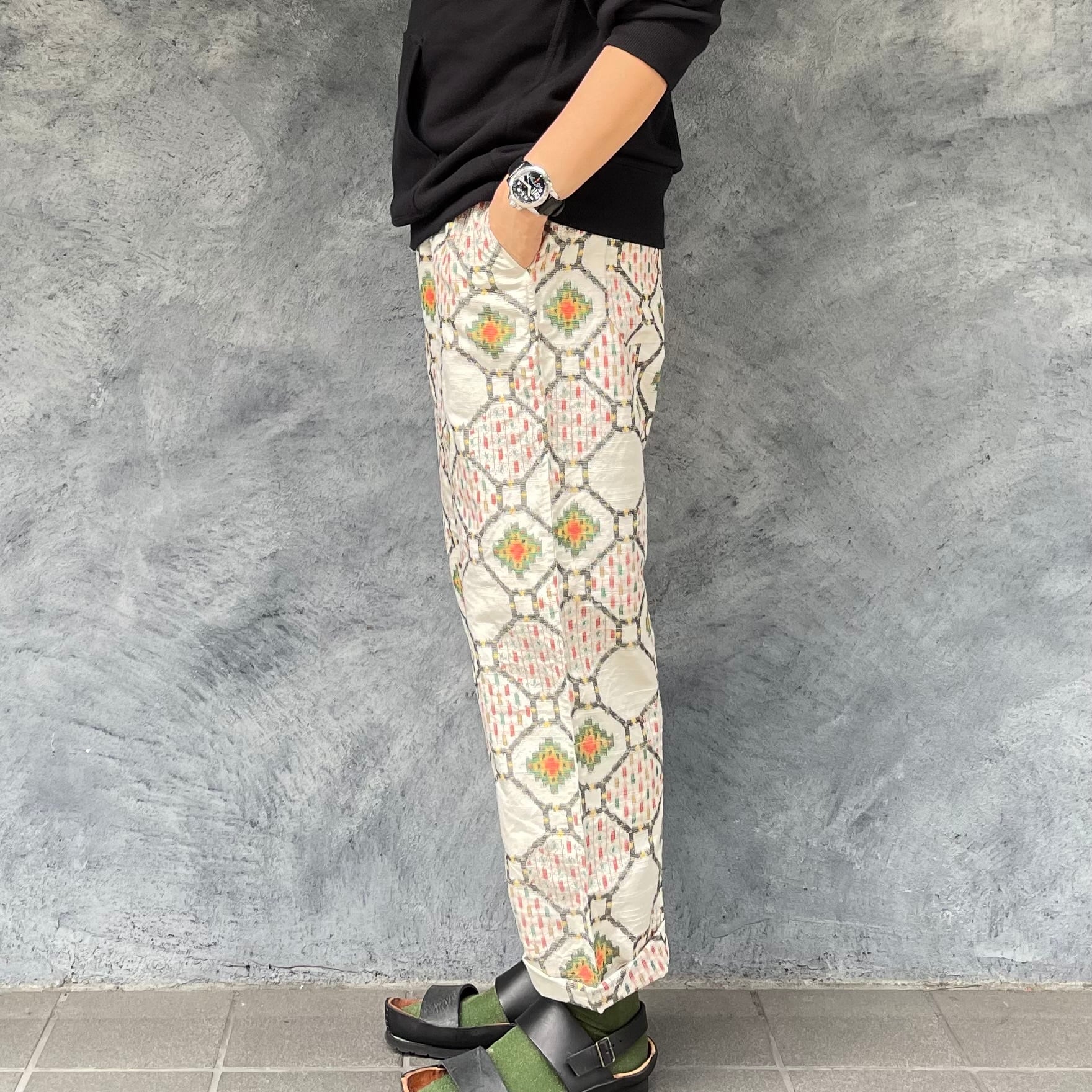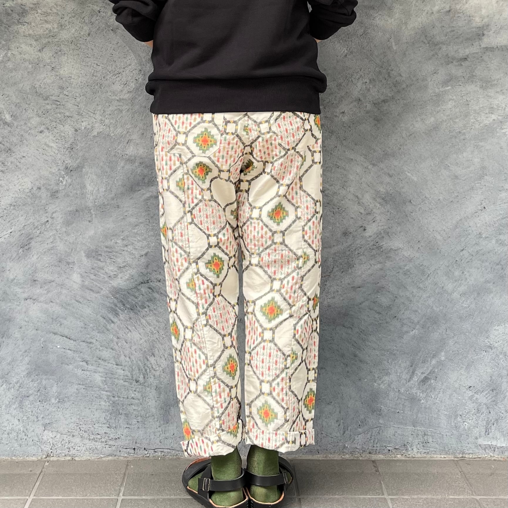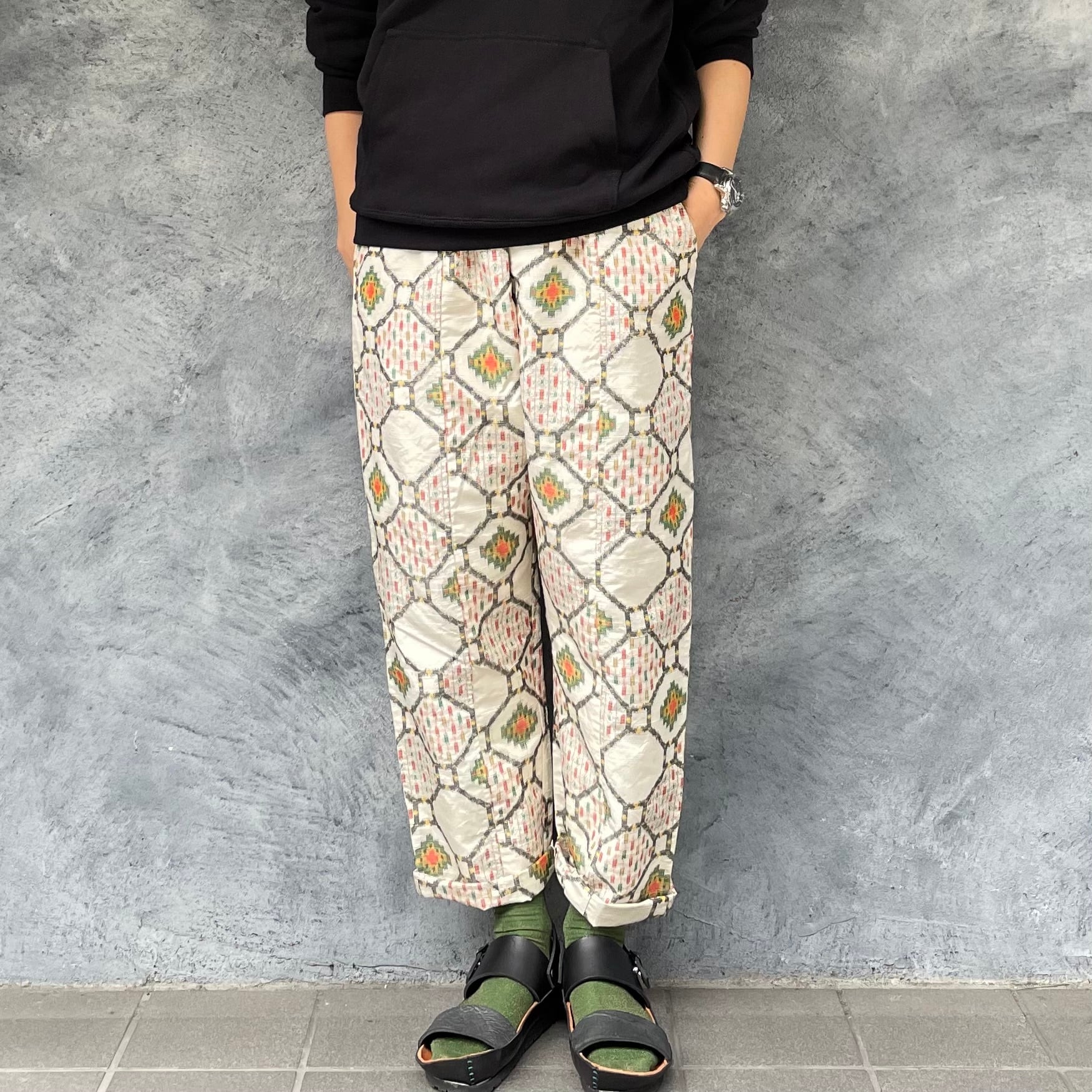 古着の紬の着物をイージーパンツに仕立て直し致しました。サンダルでも、革靴でも、カジュアルからよそ行きまでスタイリング次第で幅広く着用いただけます。
