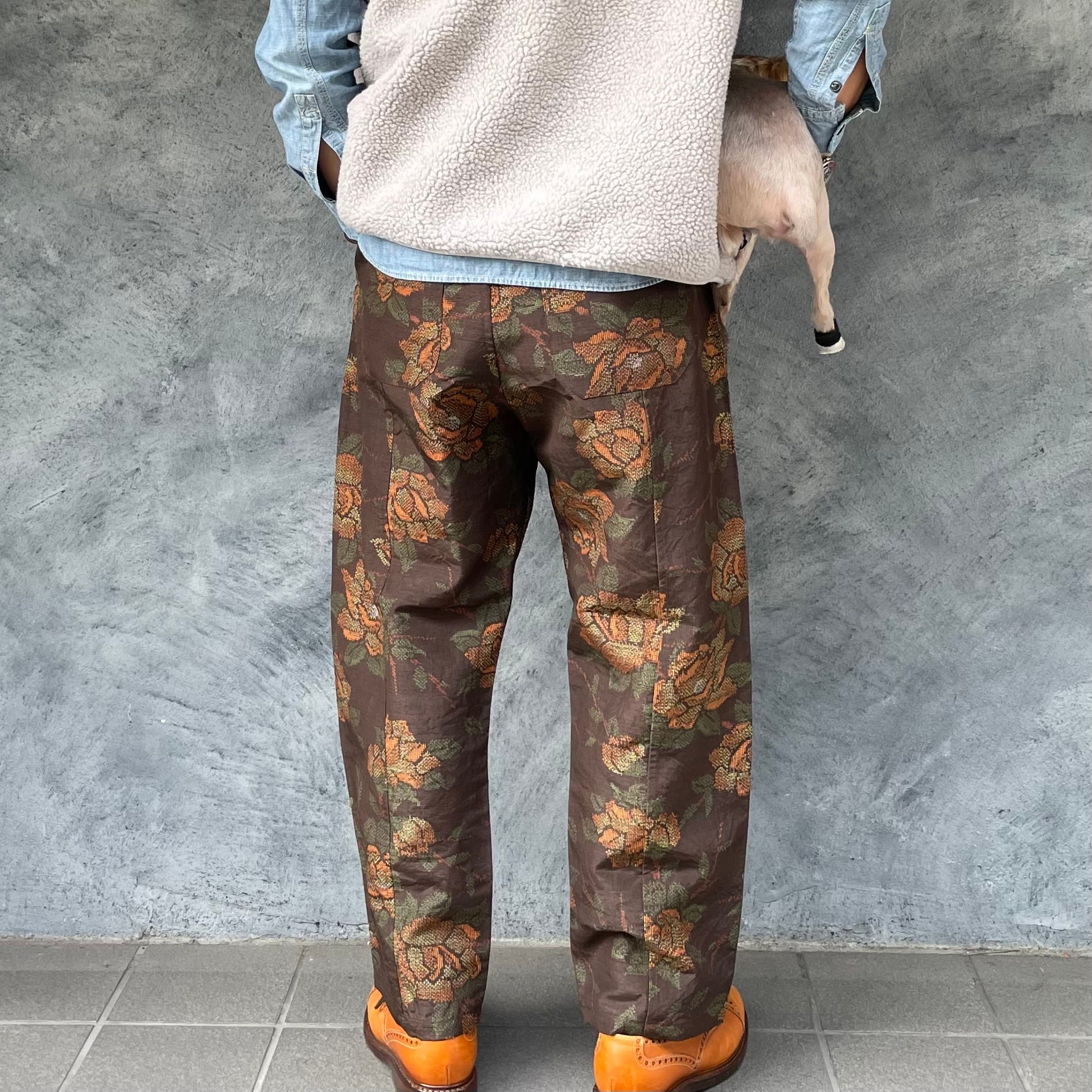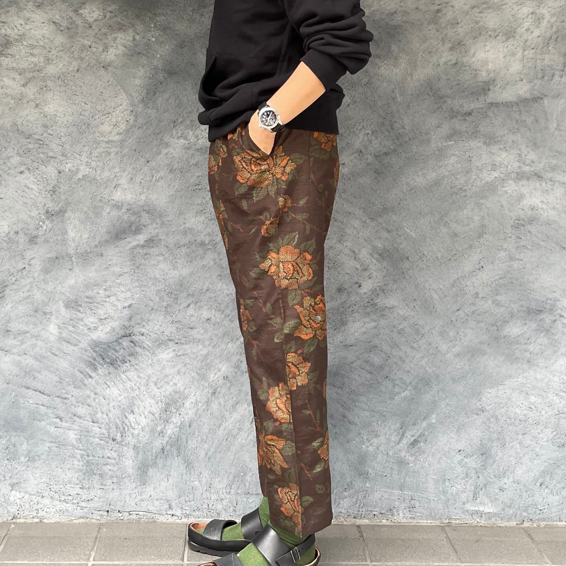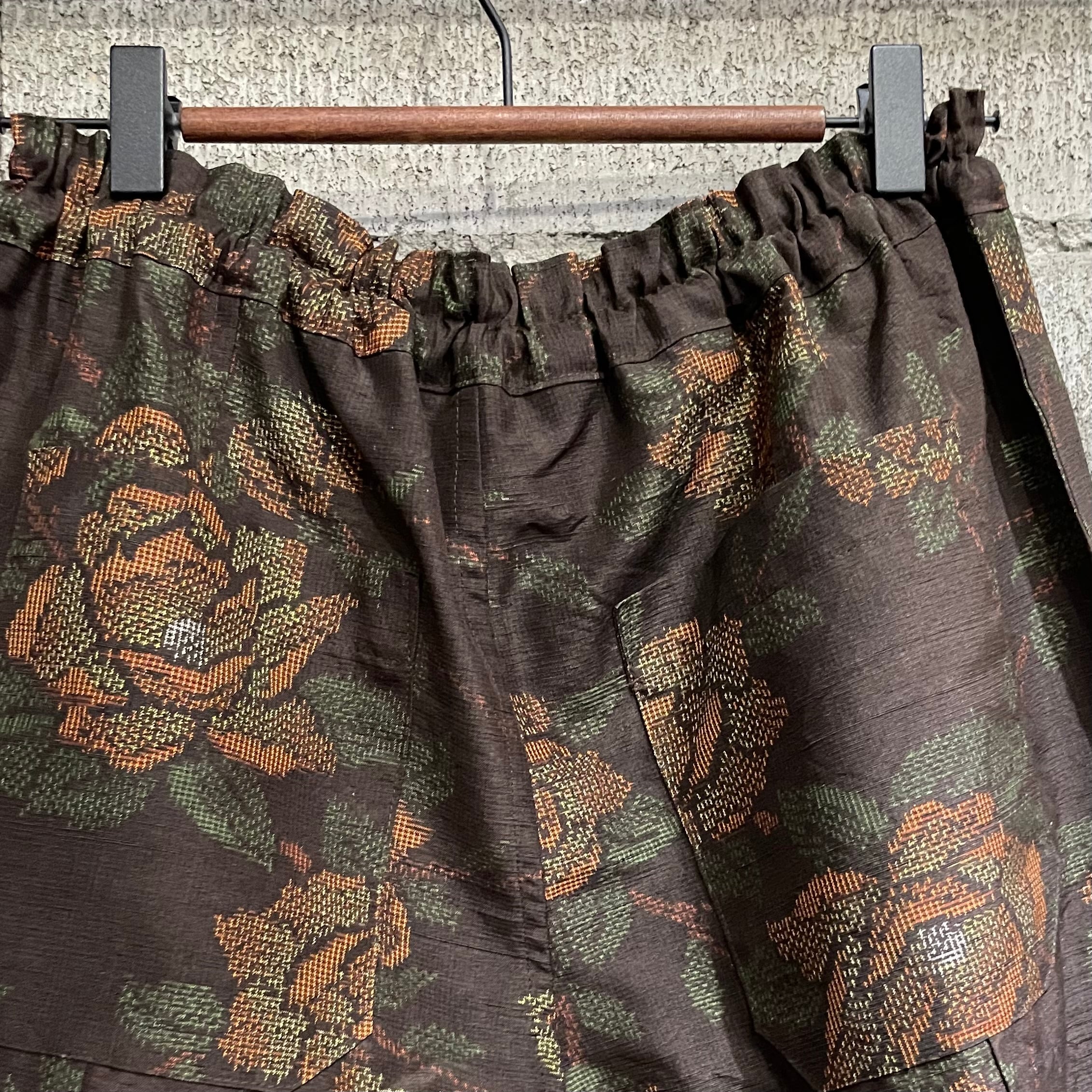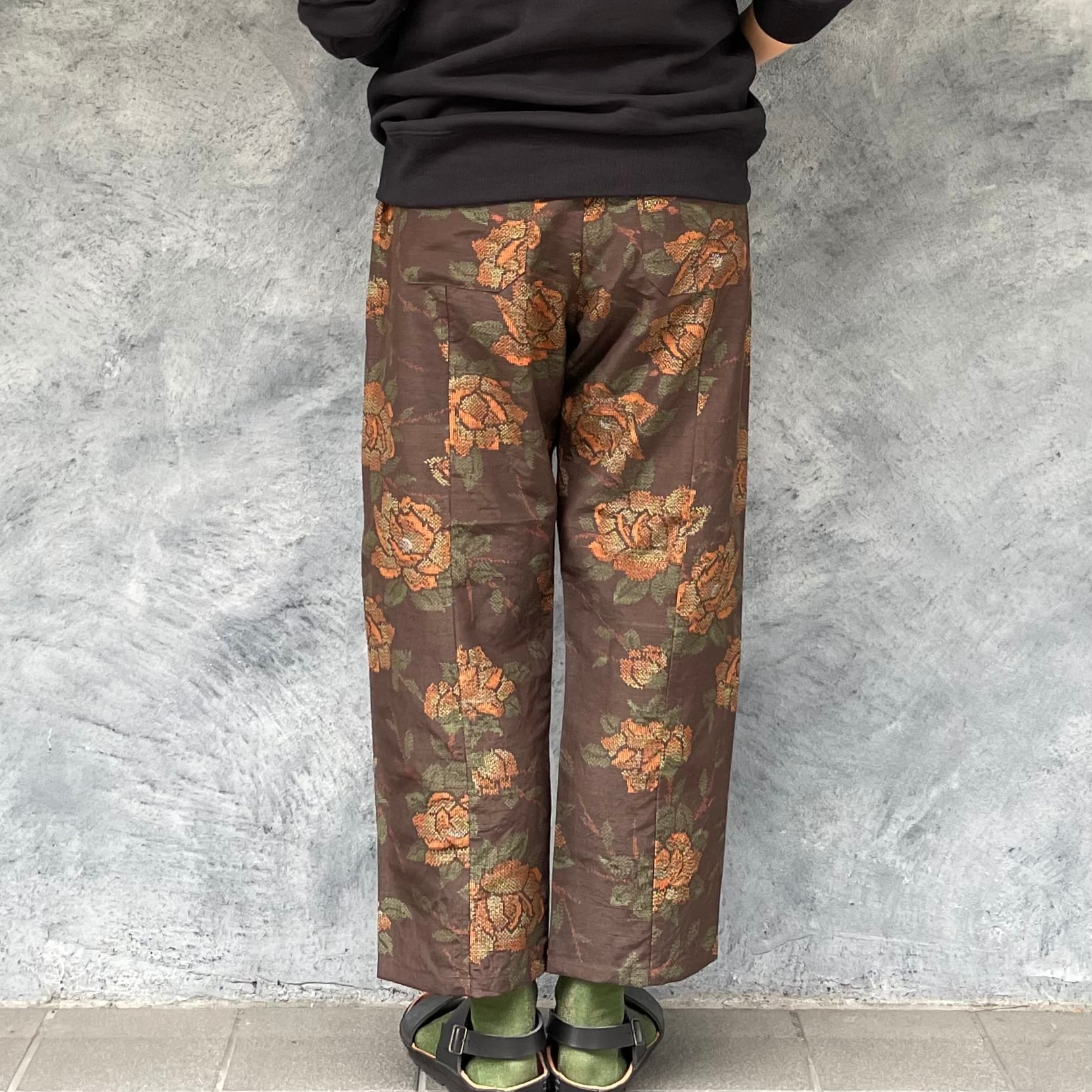 古着の紬の着物をイージーパンツに仕立て直し致しました。サンダルでも、革靴でも、カジュアルからよそ行きまでスタイリング次第で幅広く着用いただけます。