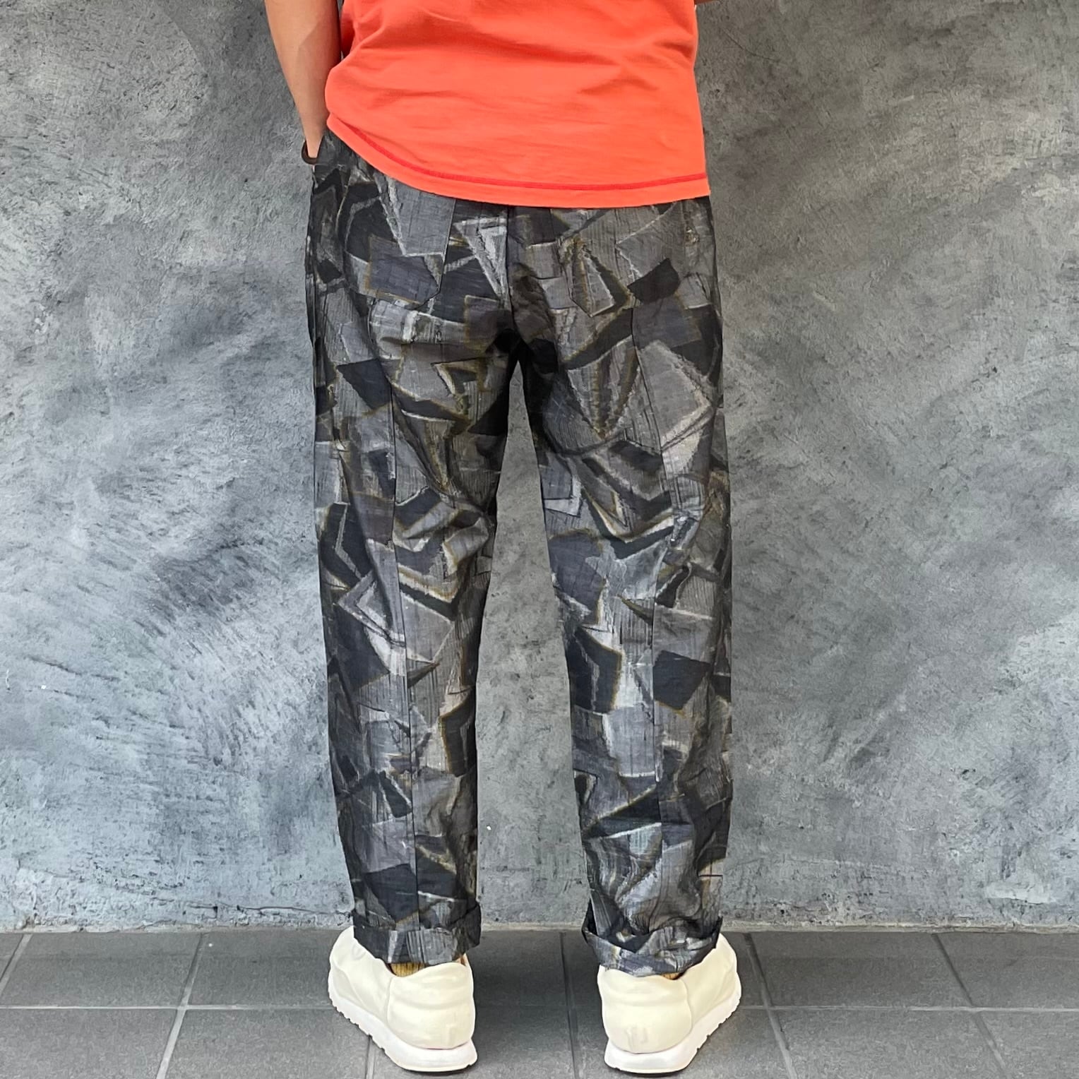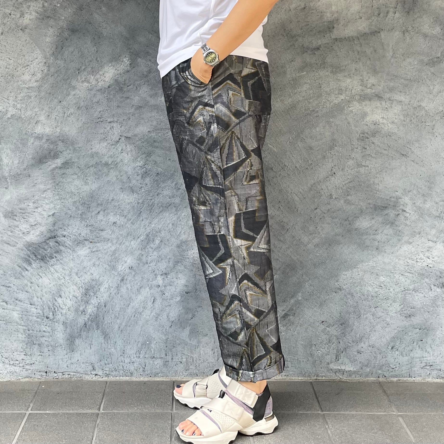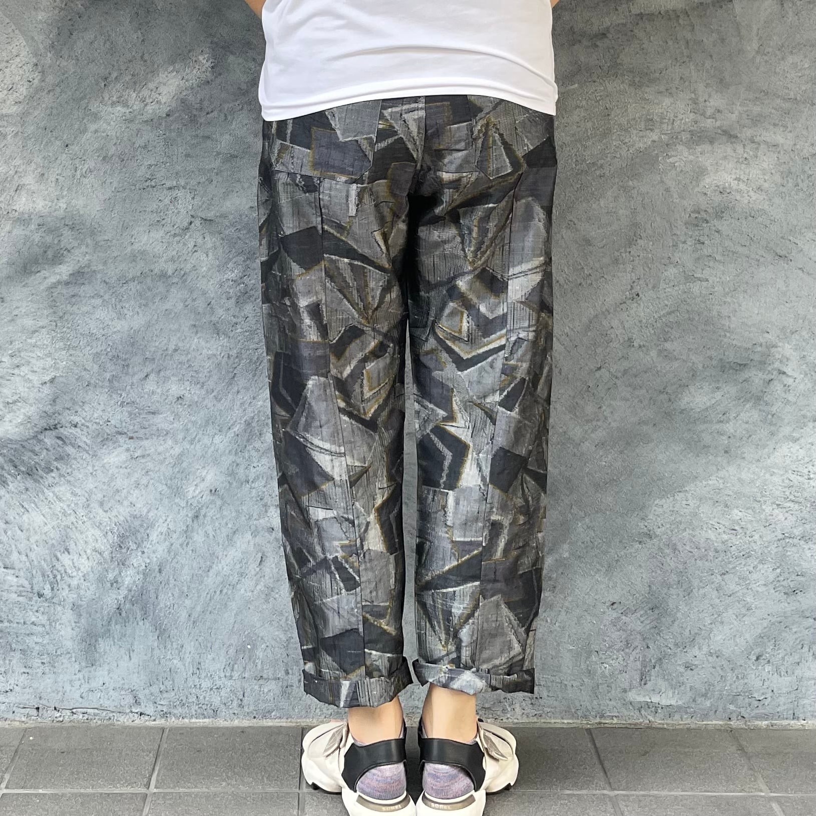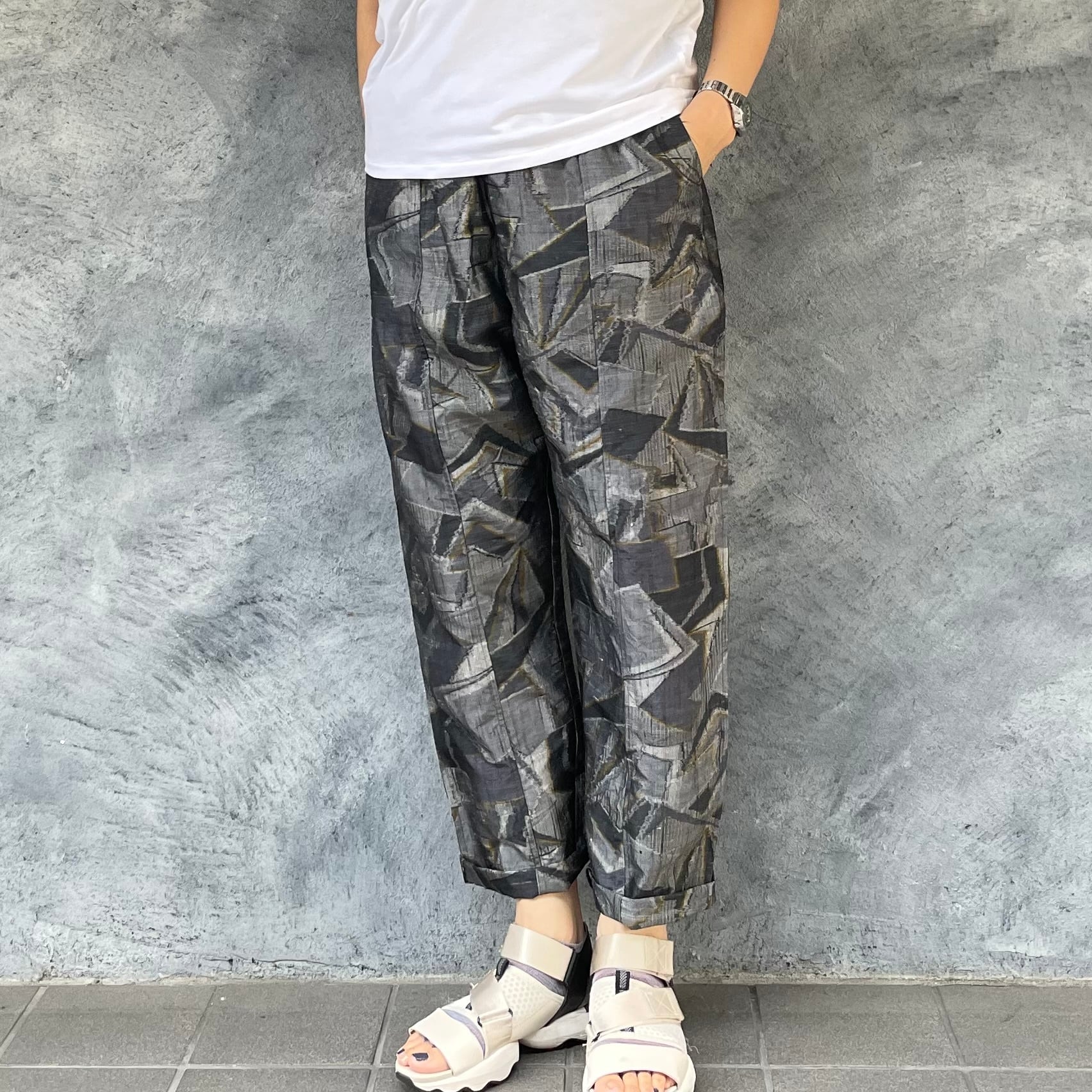 古着の紬の着物をイージーパンツに仕立て直し致しました。サンダルでも、革靴でも、カジュアルからよそ行きまでスタイリング次第で幅広く着用いただけます。