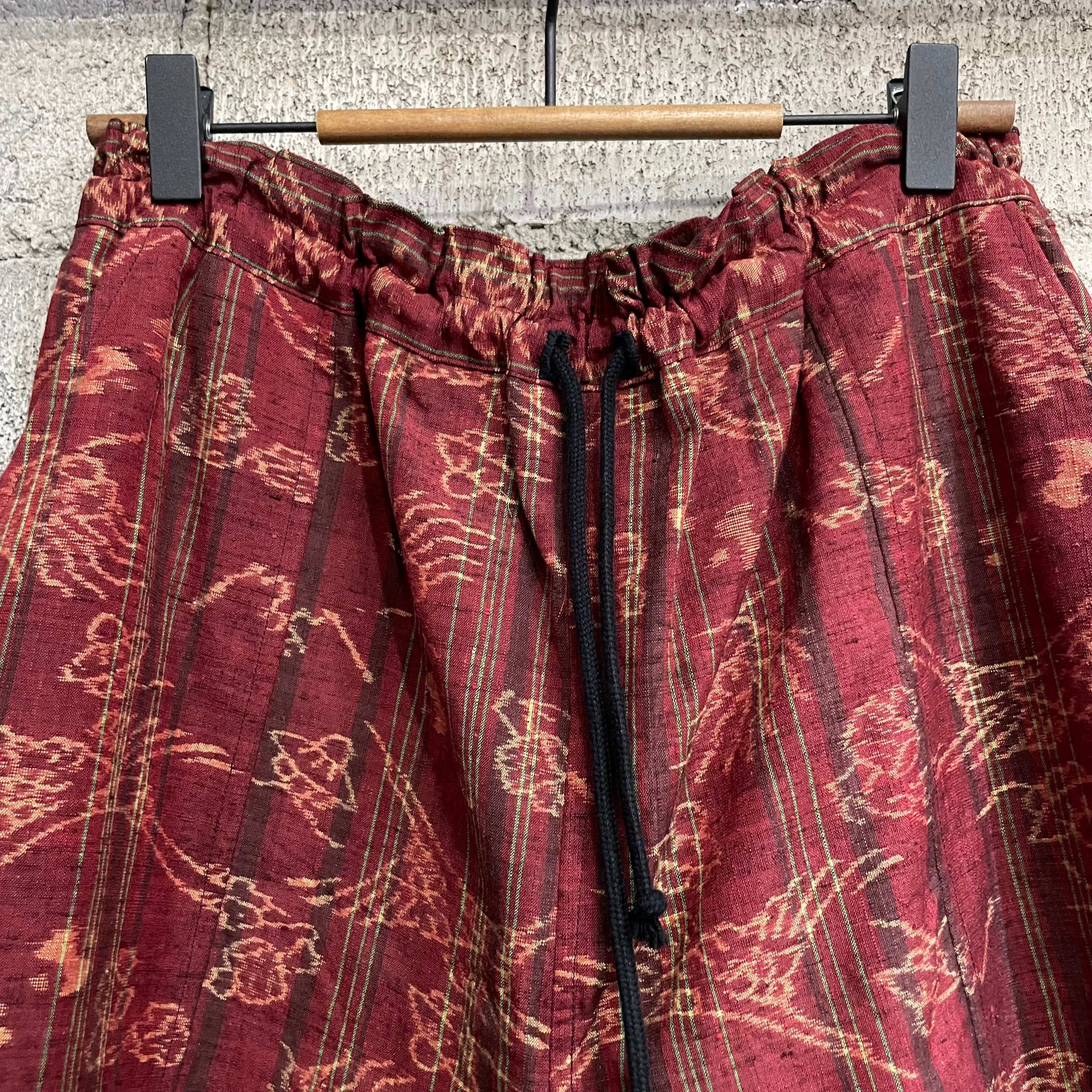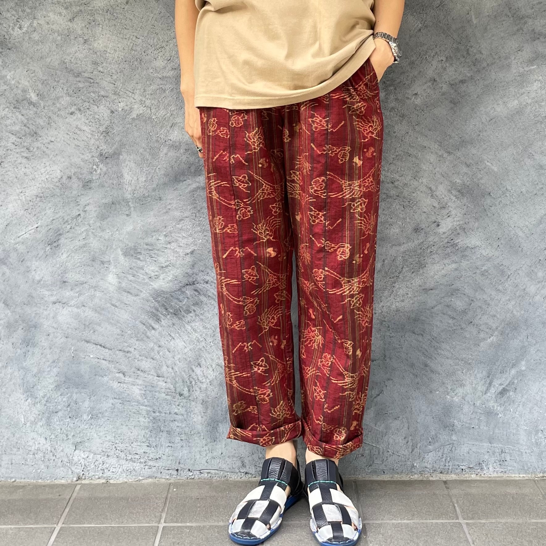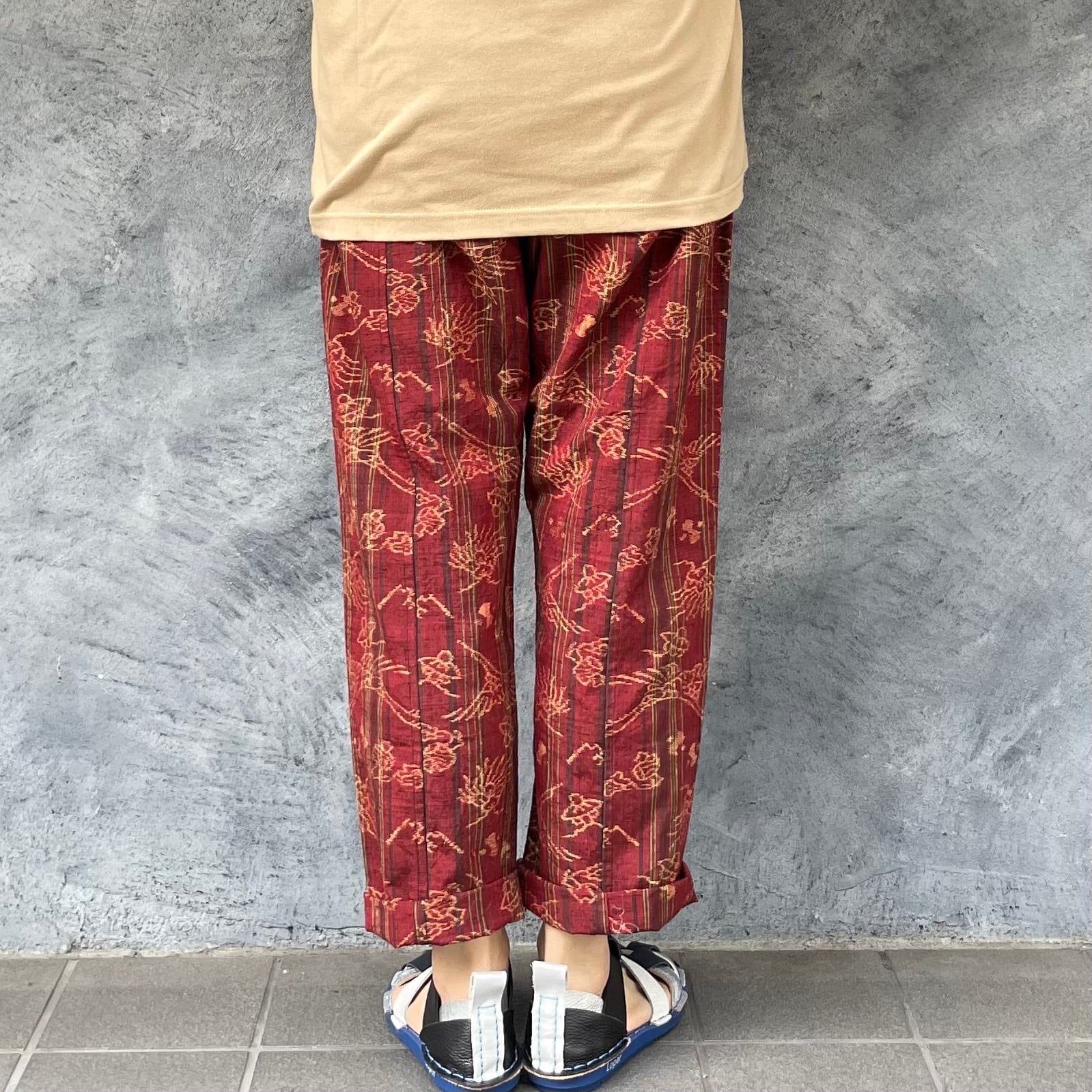古着の紬の着物をイージーパンツに仕立て直し致しました。サンダルでも、革靴でも、カジュアルからよそ行きまでスタイリング次第で幅広く着用いただけます。
