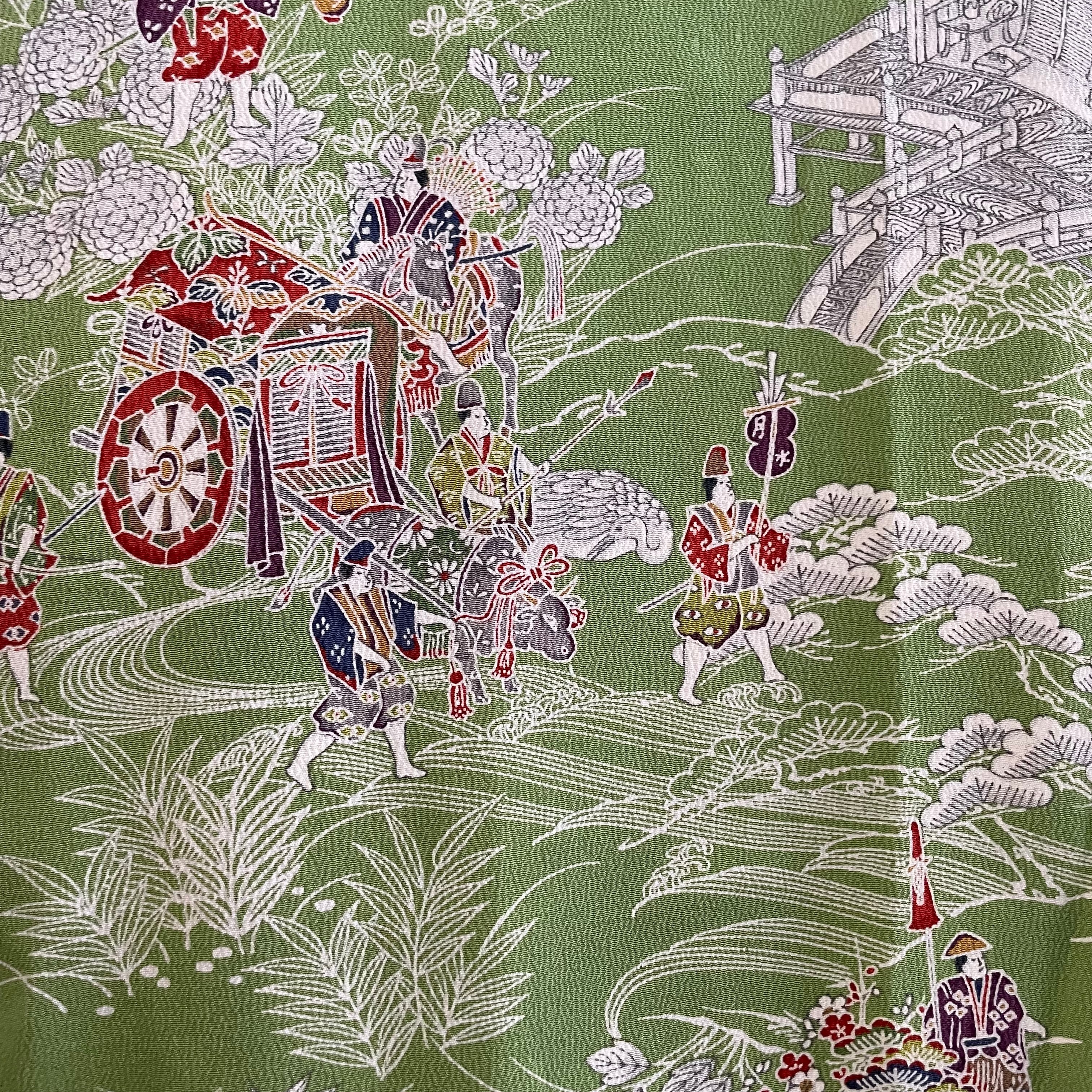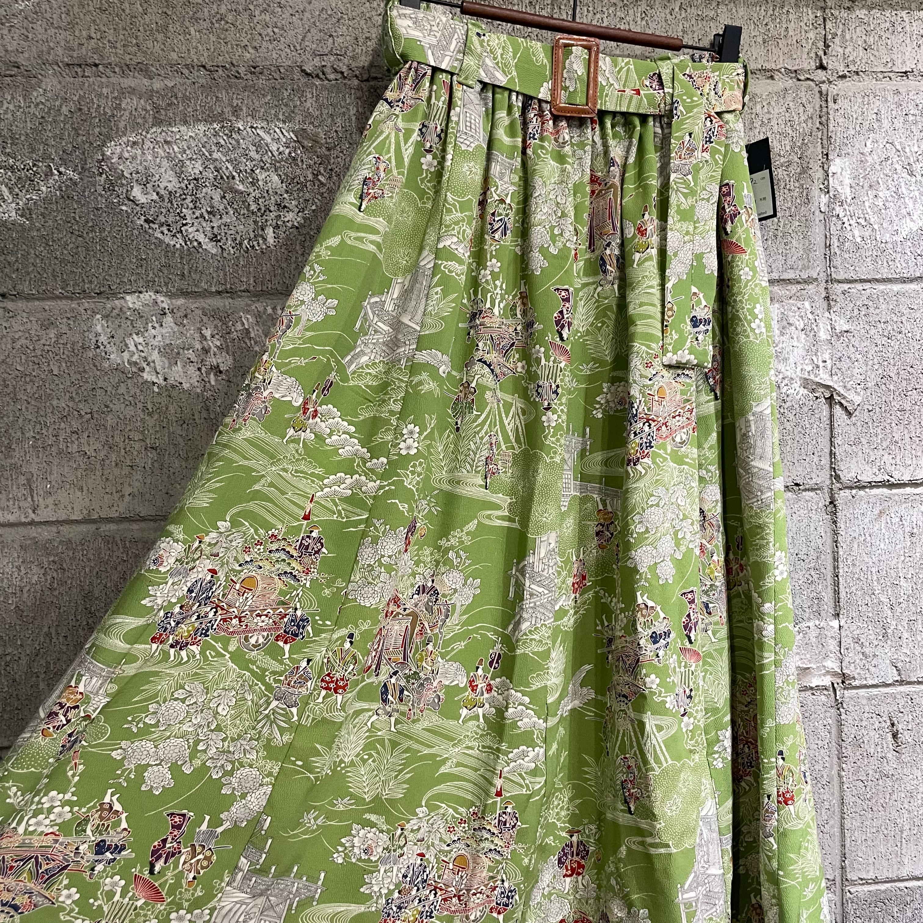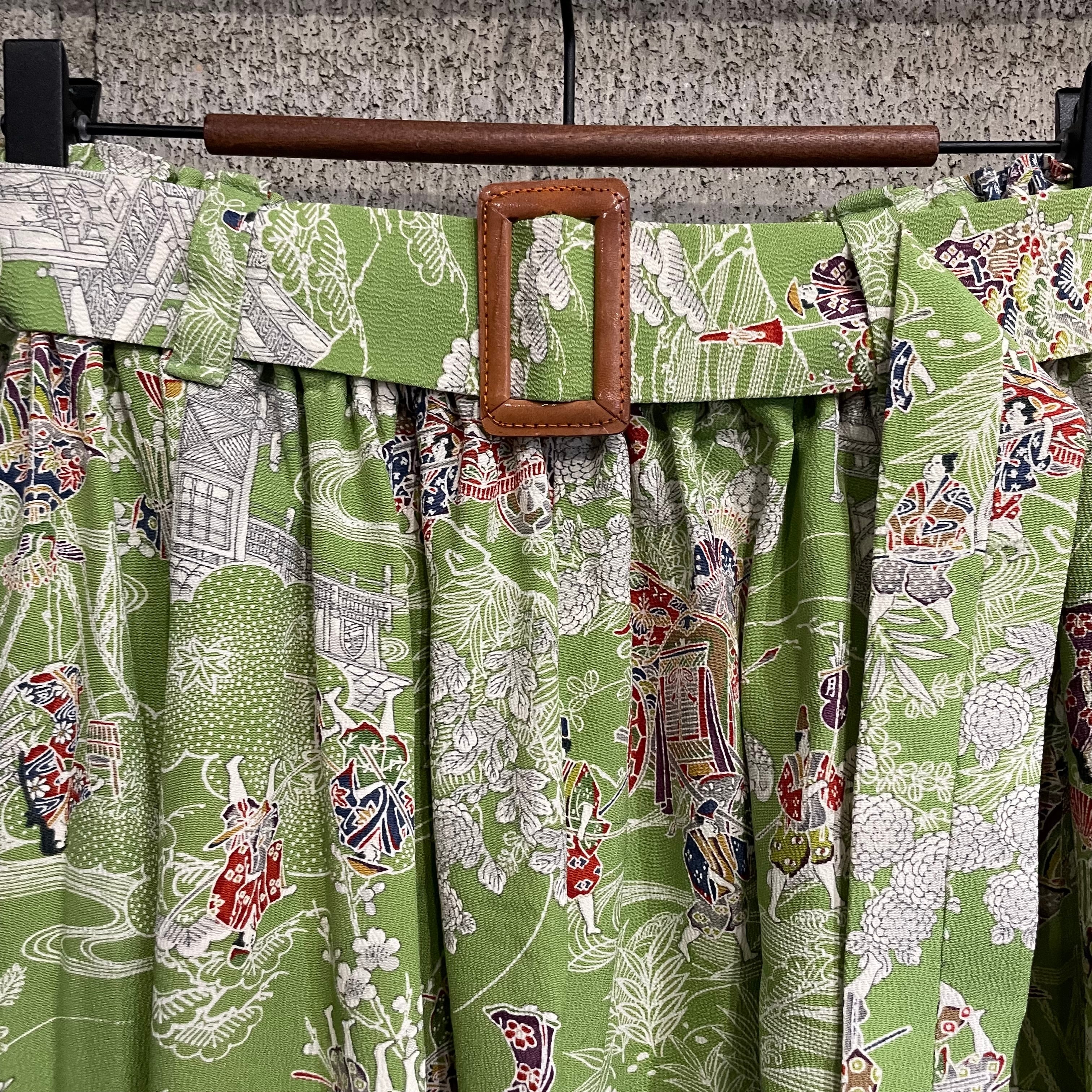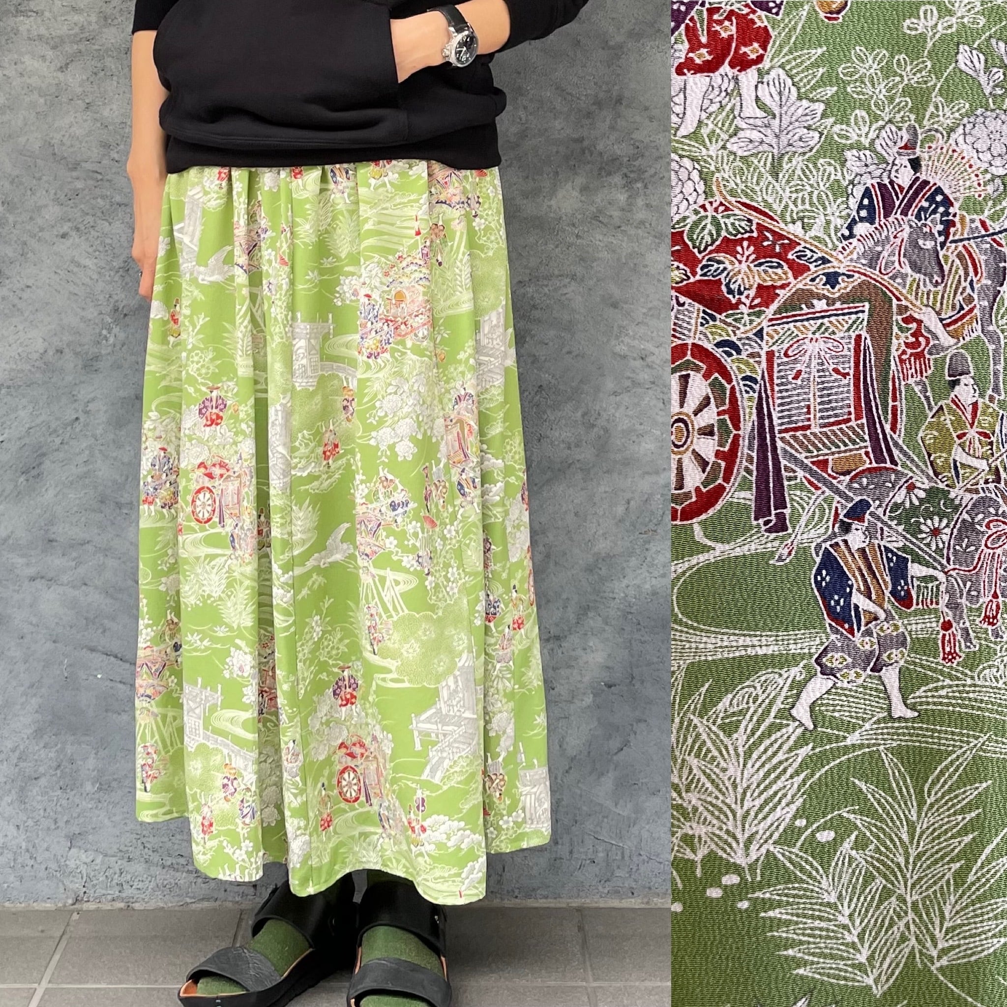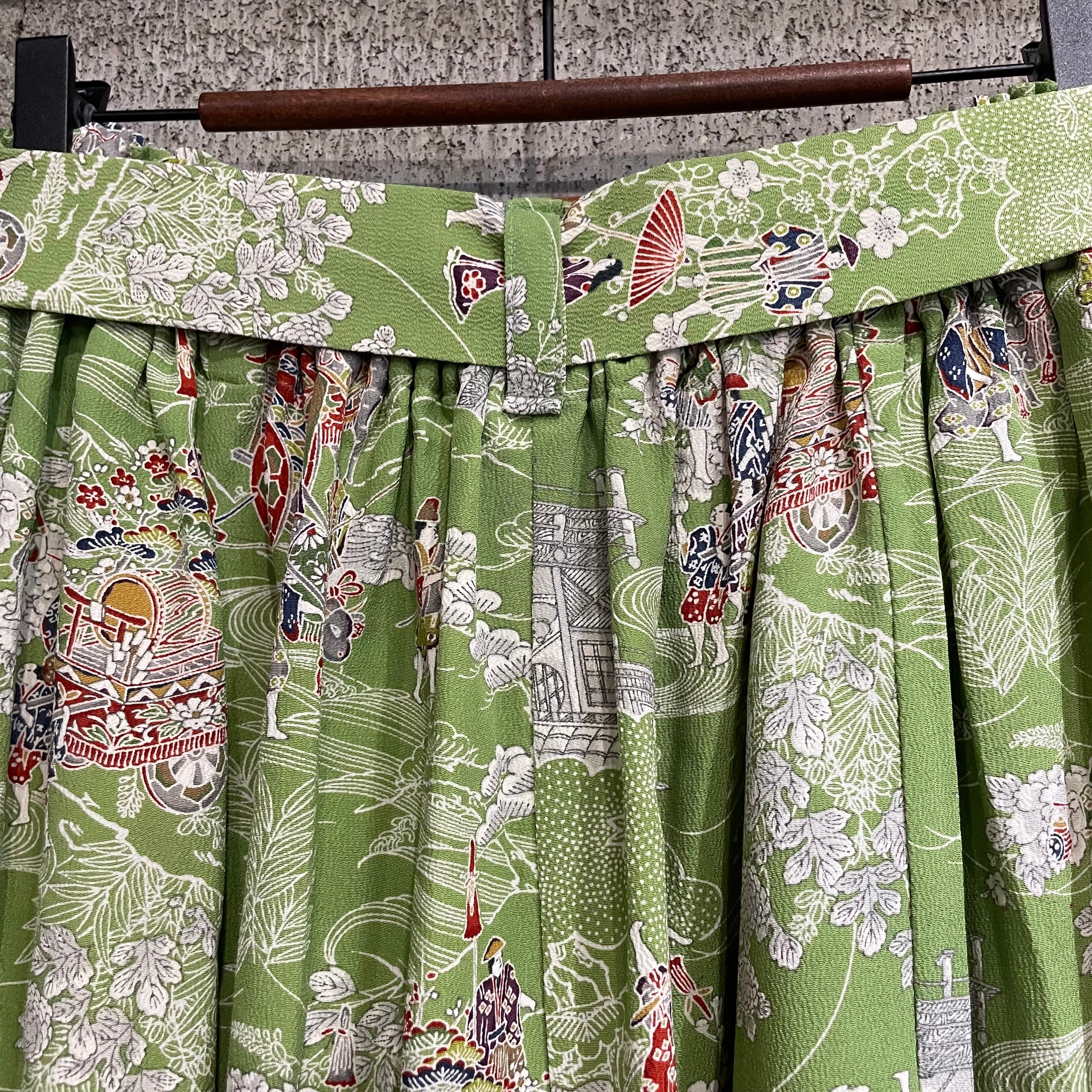 古着の縮緬小紋の着物をギャザーロングスカートに仕立てました。黄緑色地に時代模様が上品でユニーク。サラリと落ち感の美しいお品です。