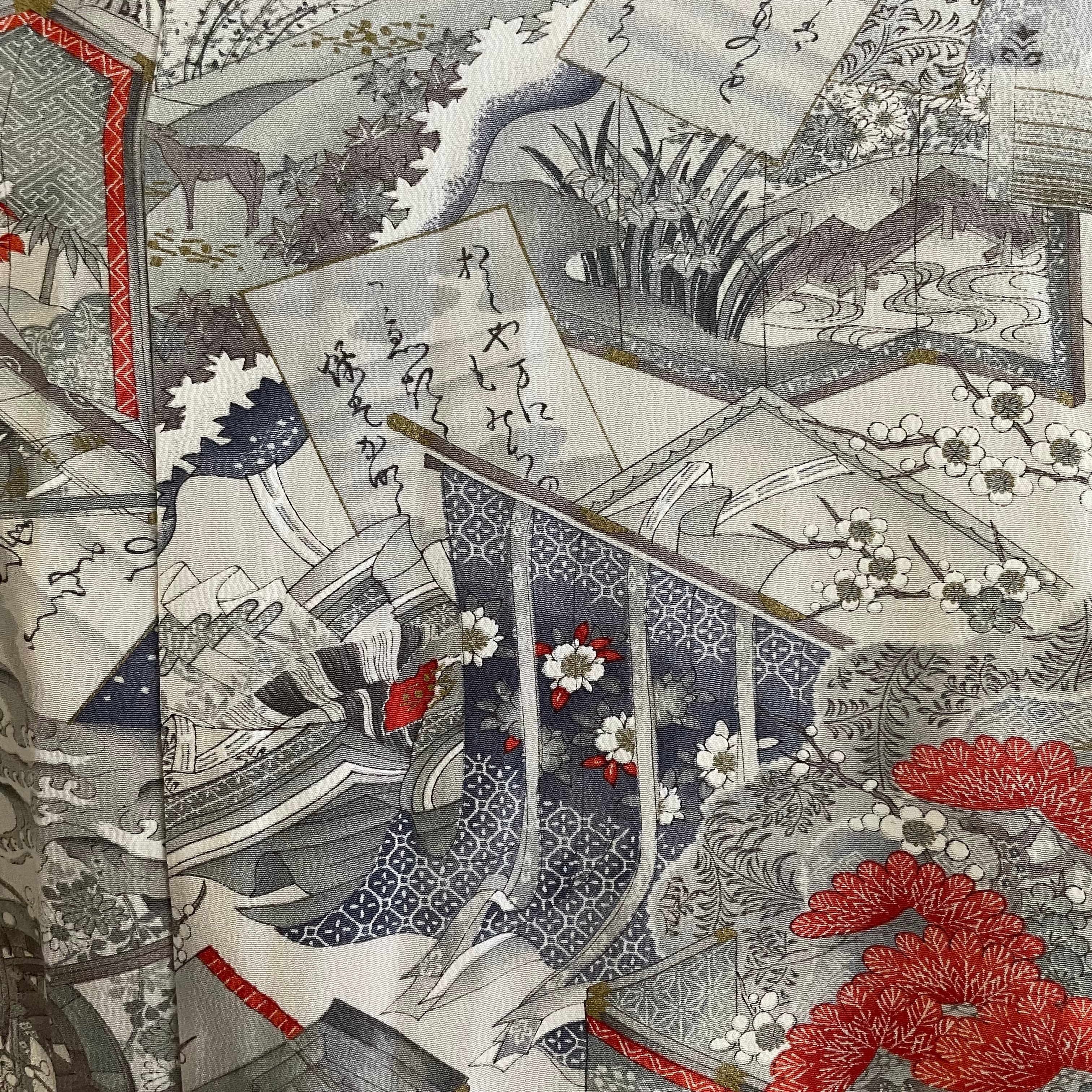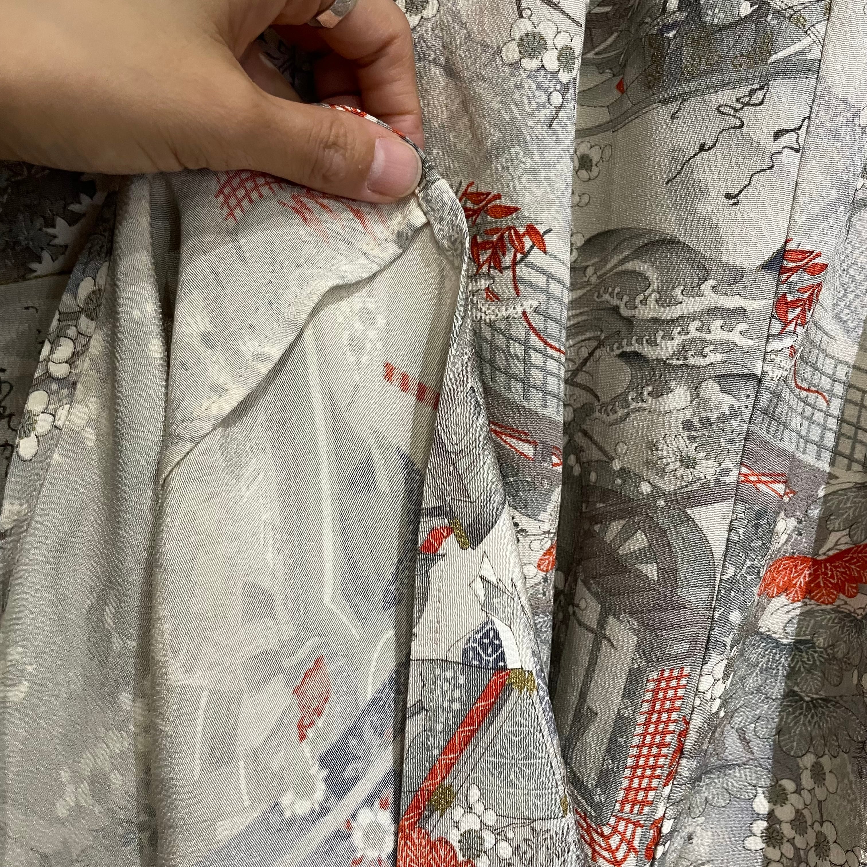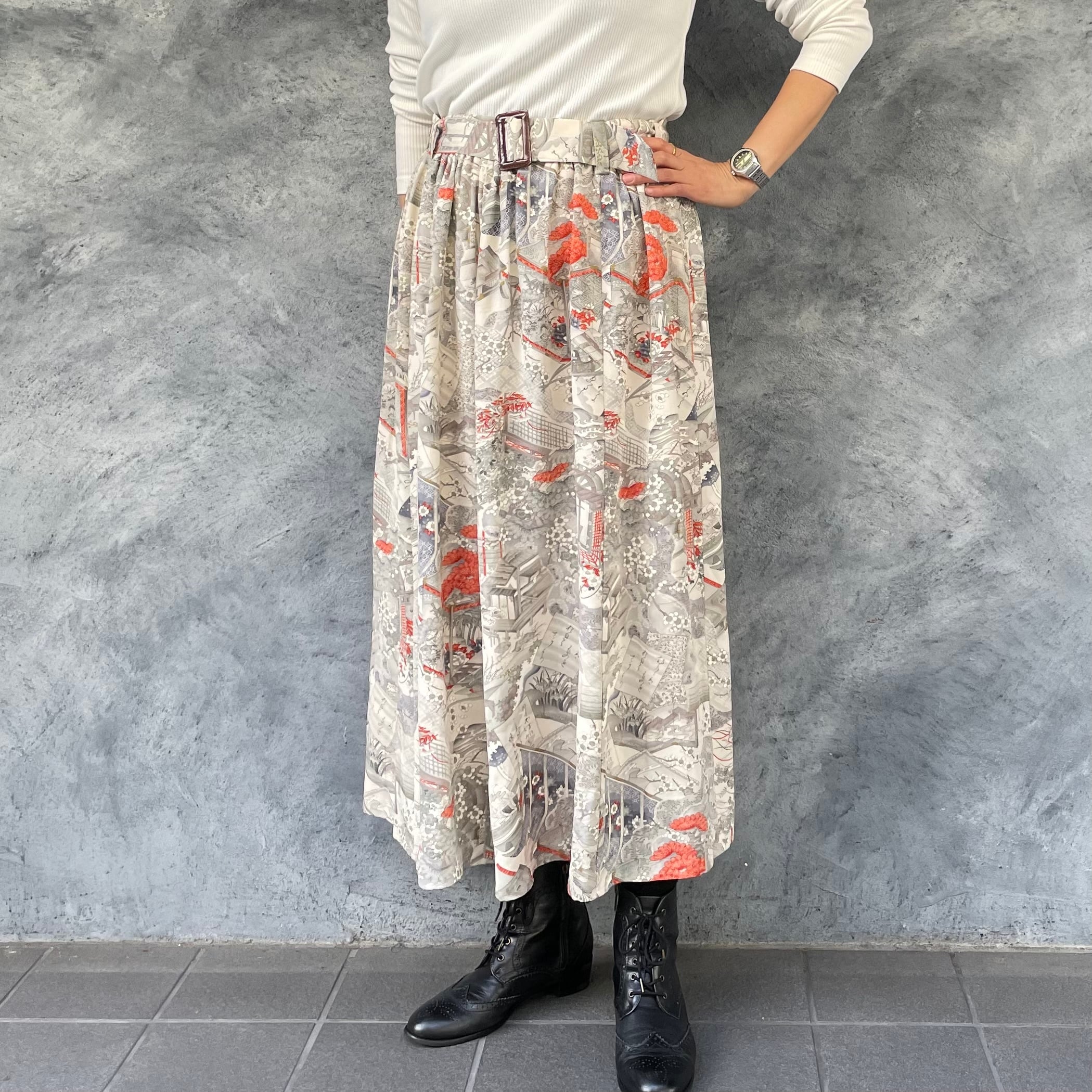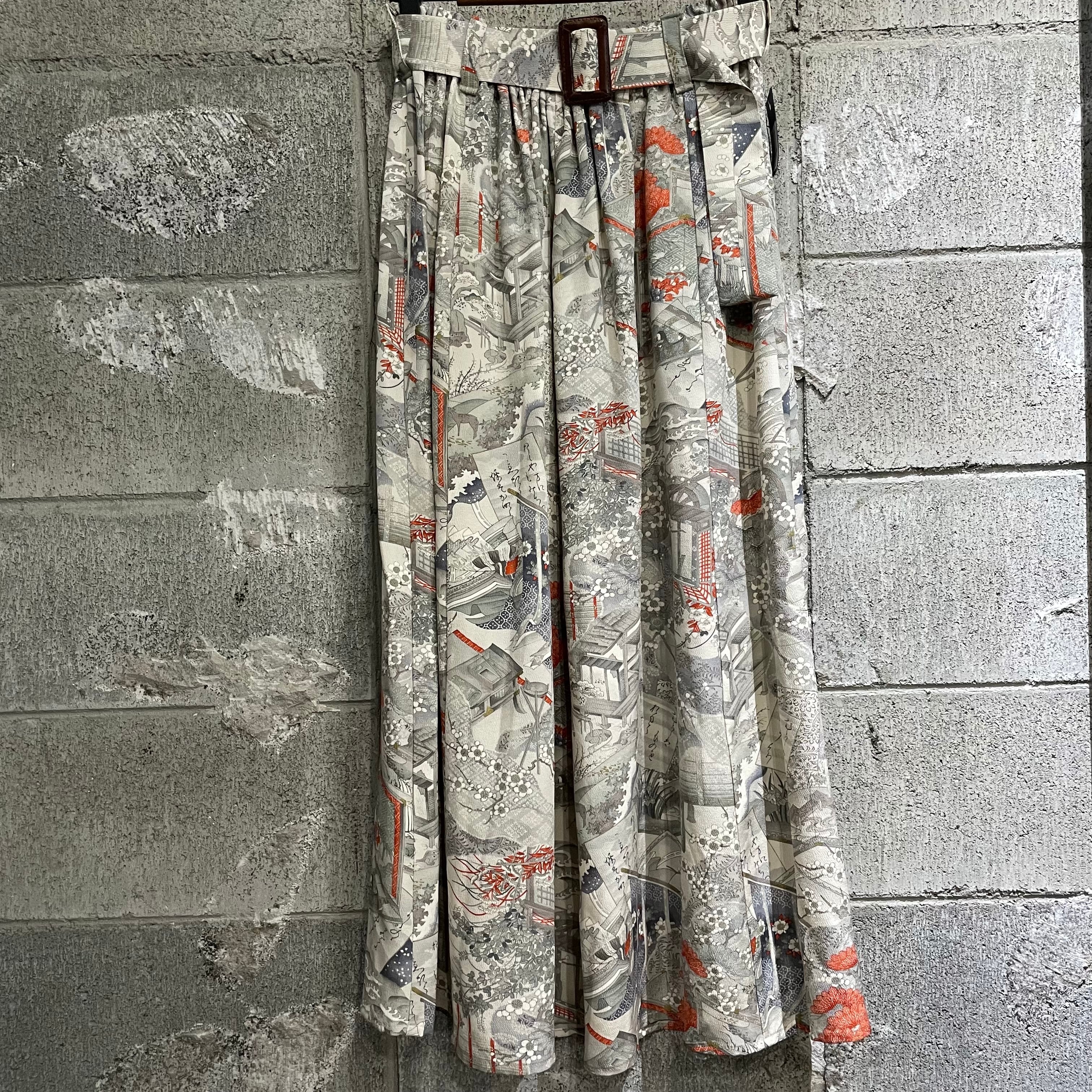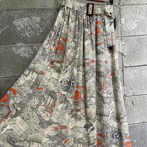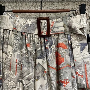 古着の縮緬小紋の着物をギャザーロングスカートに仕立てました。白地に時代模様が上品でユニーク。サラリと落ち感の美しいお品です。