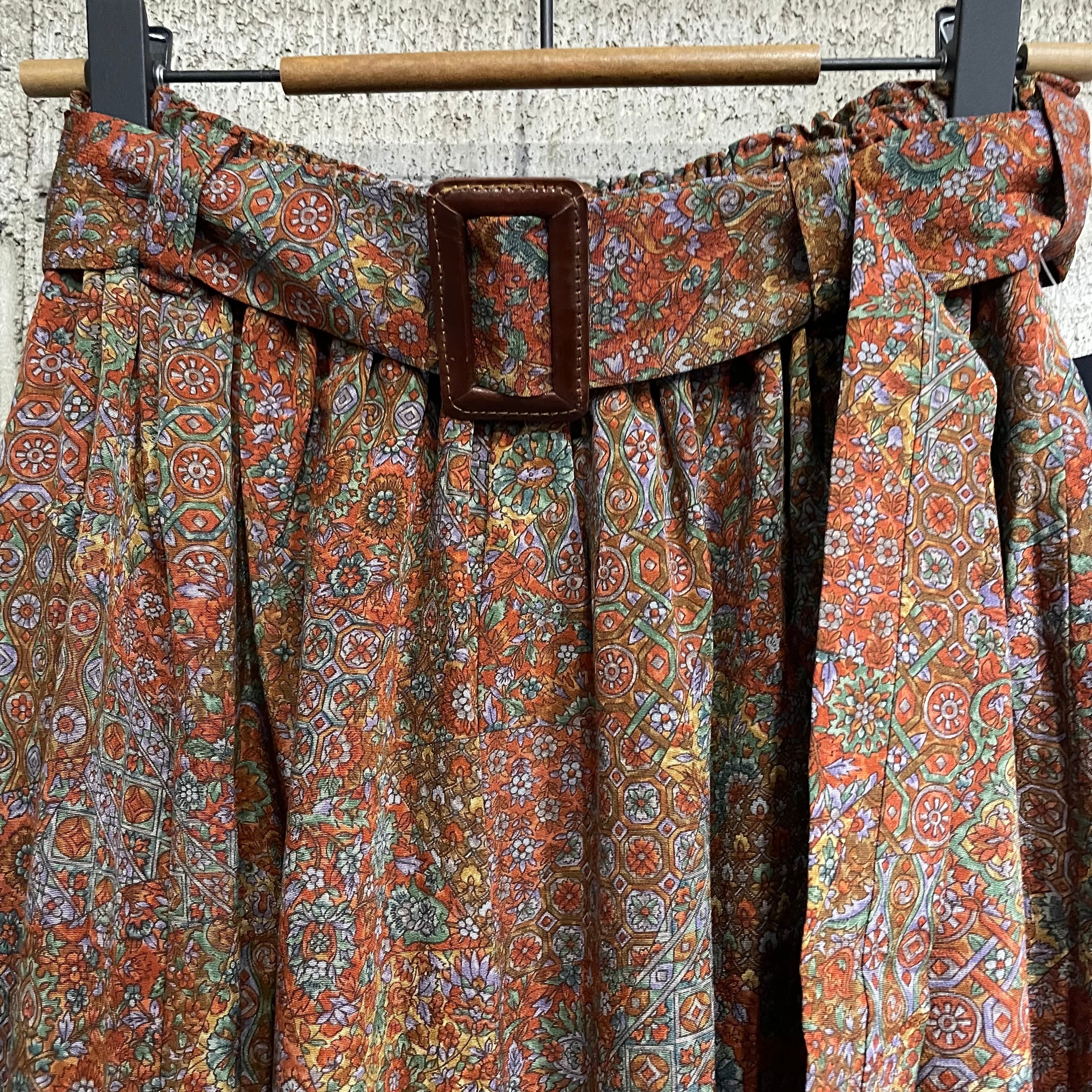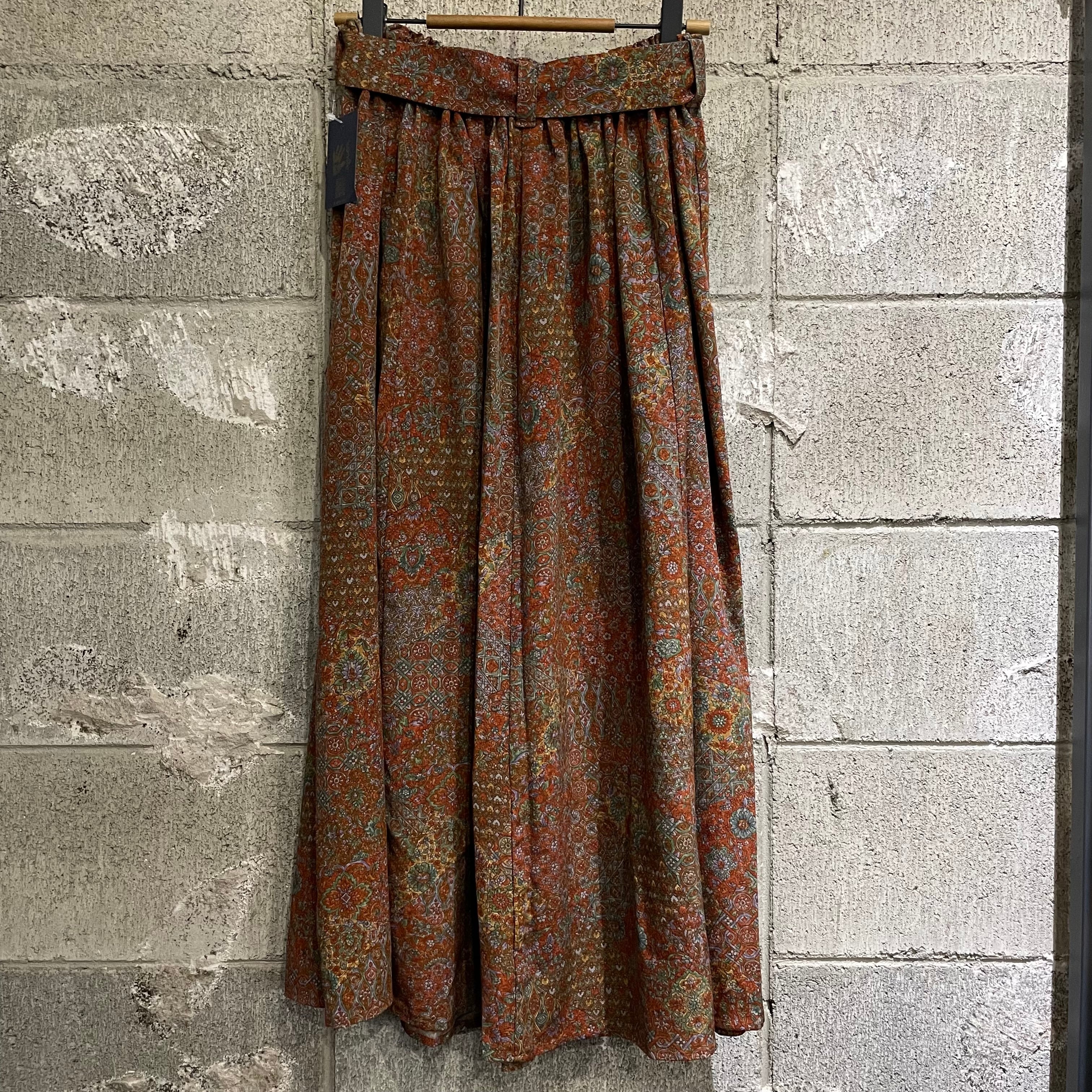 古着の小紋の羽織をギャザーロングスカートに仕立てました。地模様の入った赤色地にPOPな壺がたくさん描かれています。薄手で軽く美しいお品です。