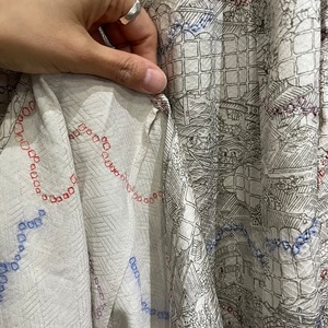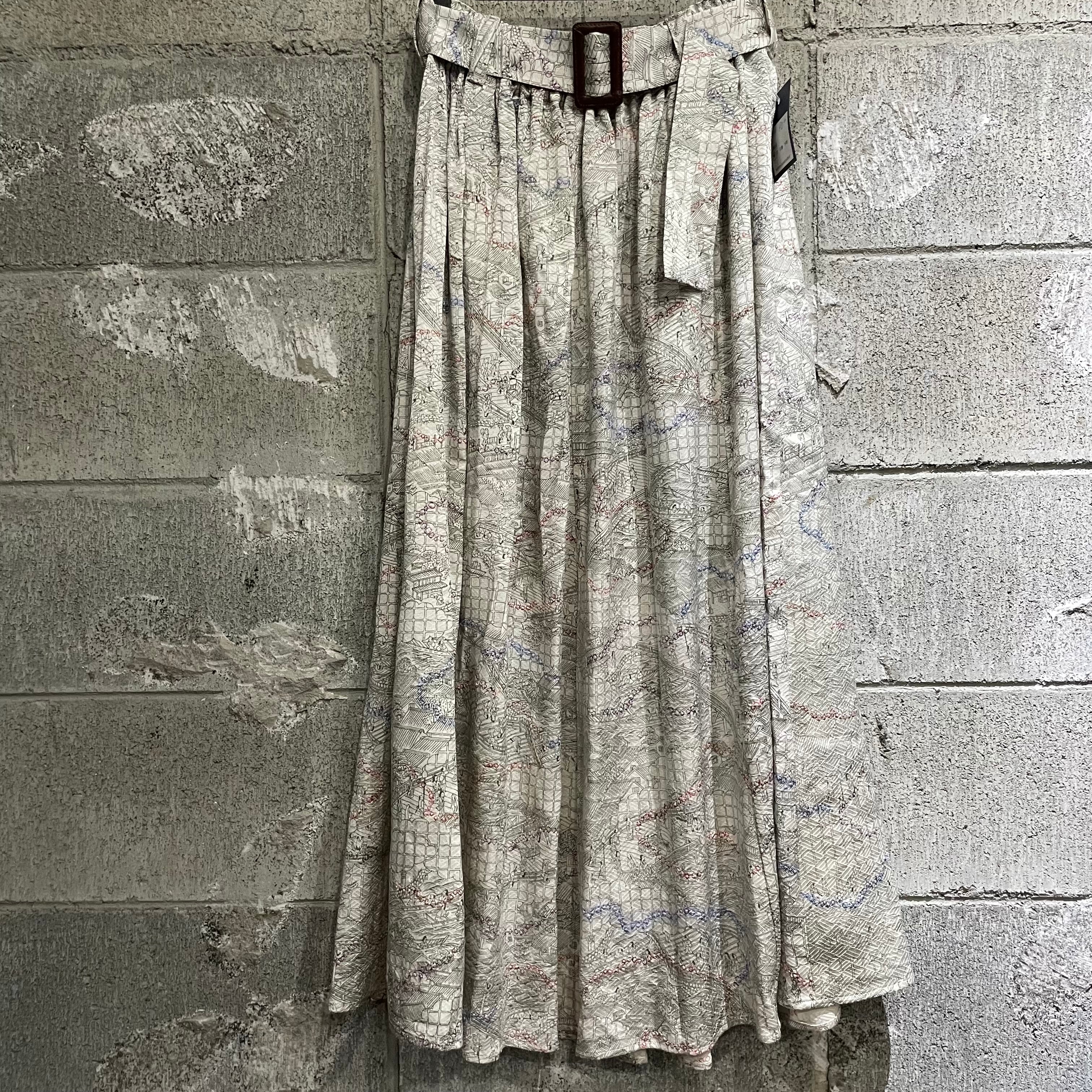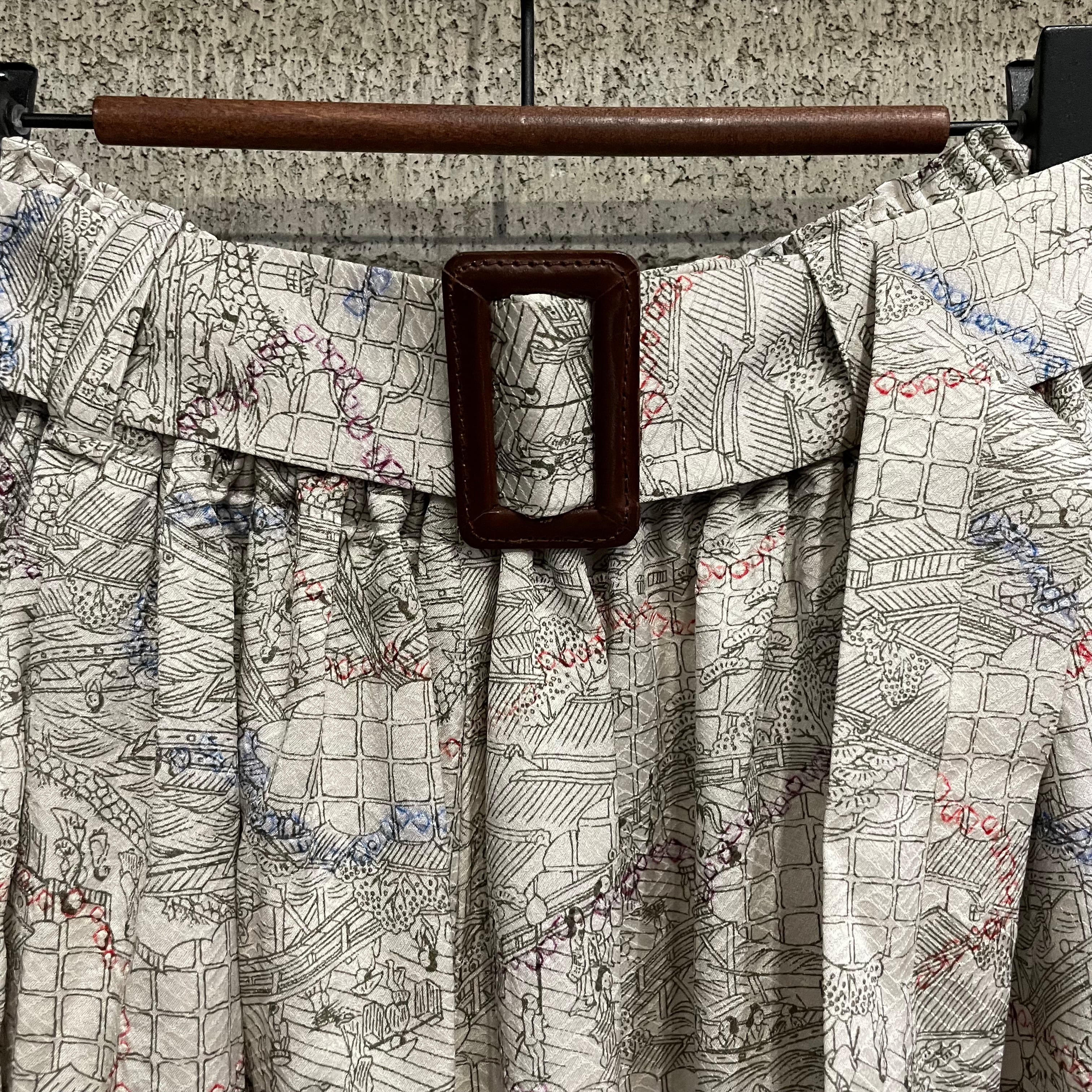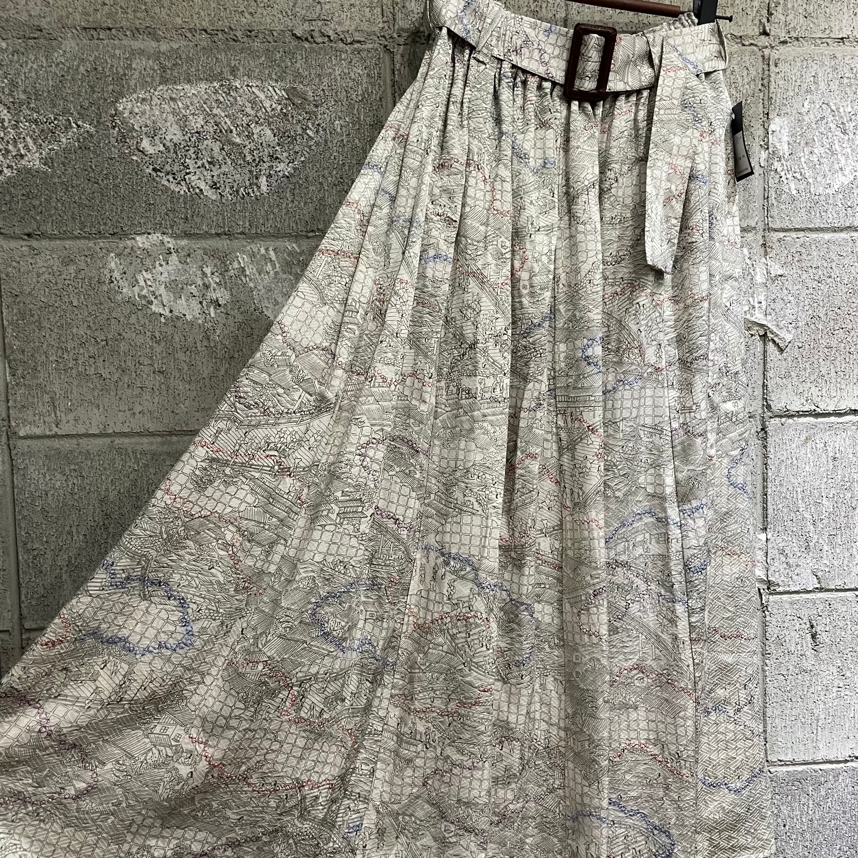 古着の小紋の着物をギャザーロングスカートに仕立てました。一部絞りを施した光沢のある白地に時代模様が描かれています。サラリと落ち感の美しいお品です。