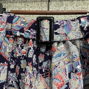 古着の縮緬小紋の着物をギャザーロングスカートに仕立てました。落ち着いた紫色地に時代模様が描かれています。サラリと落ち感の美しいお品です。